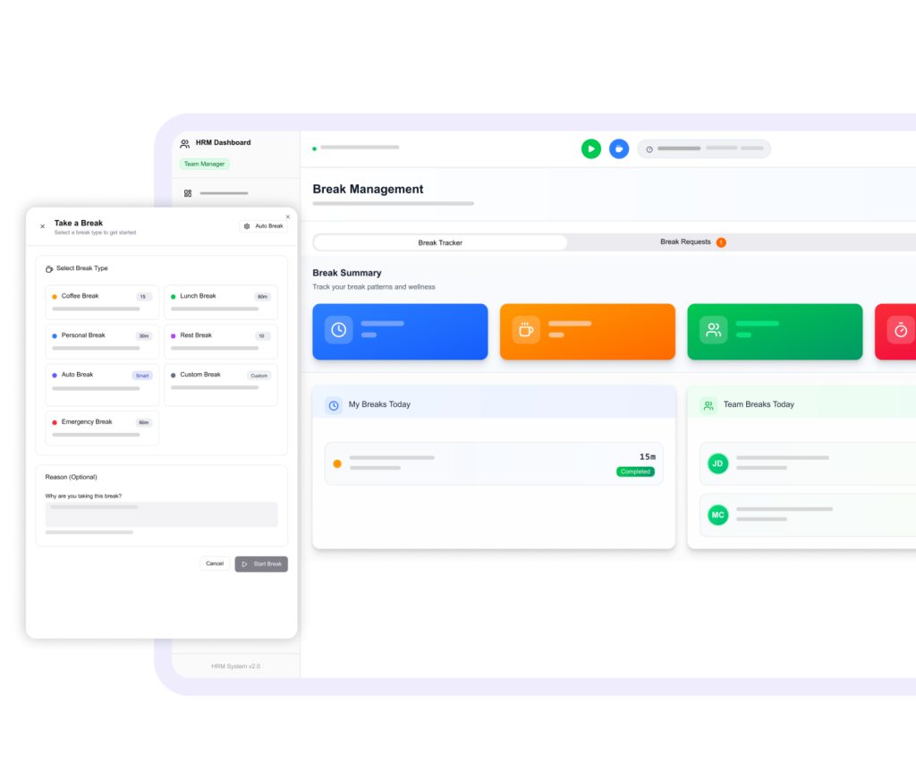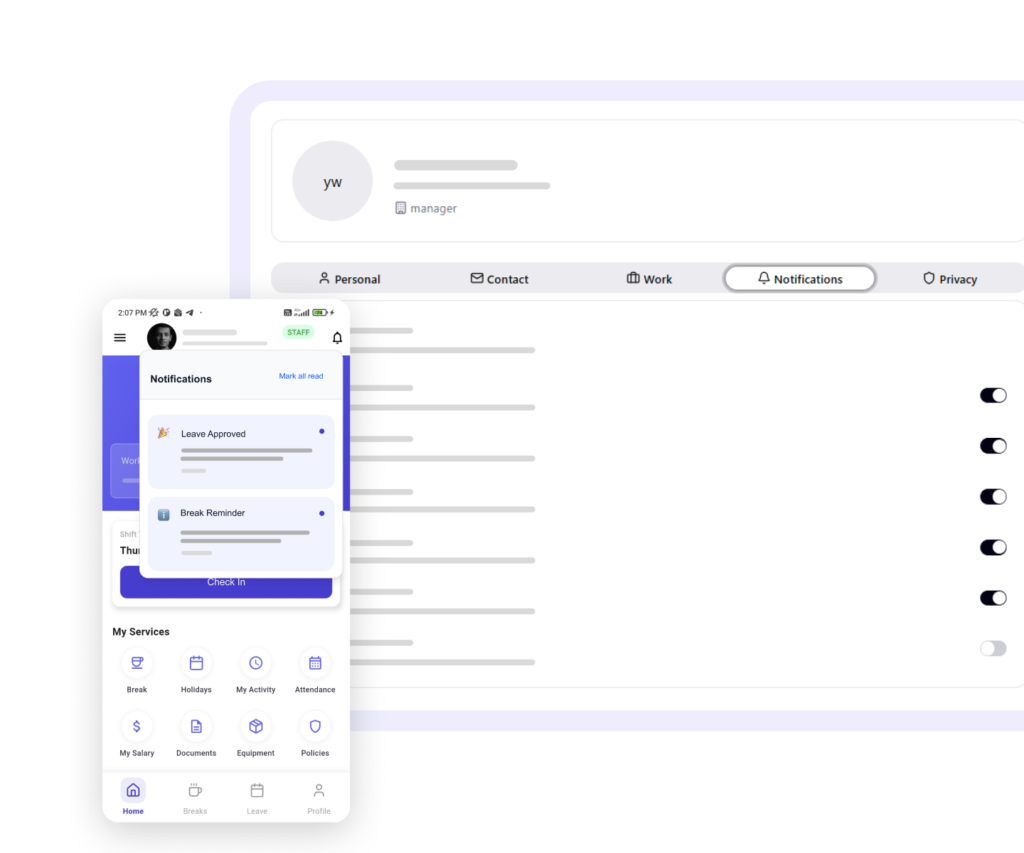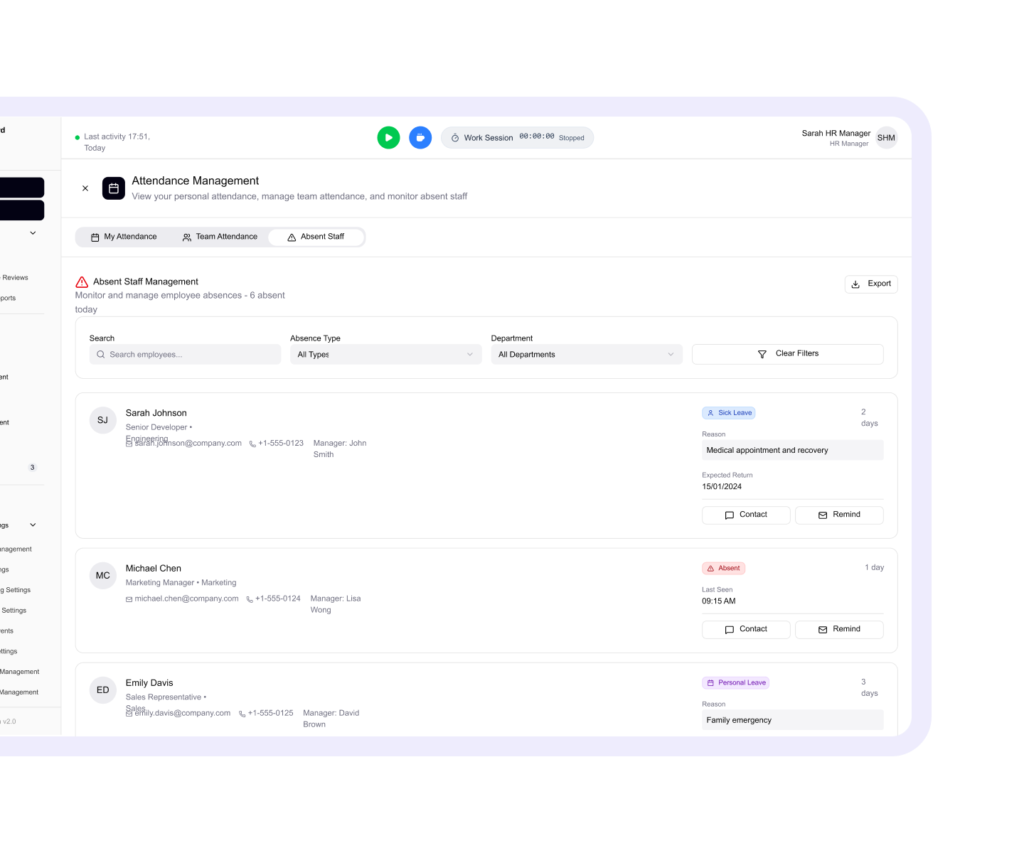 Track work hours, shifts, breaks, and productivity- all in one dashboard.