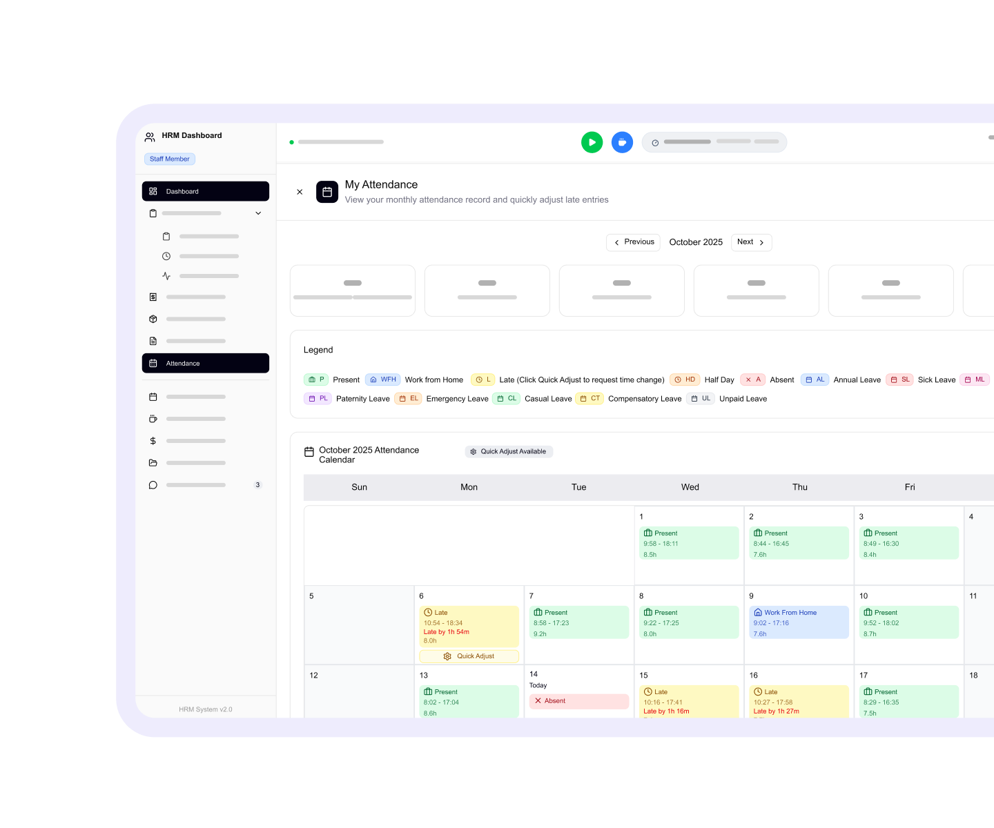 - Trends: absenteeism, late arrivals, overtime