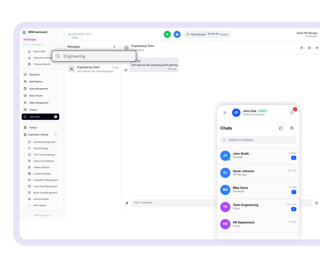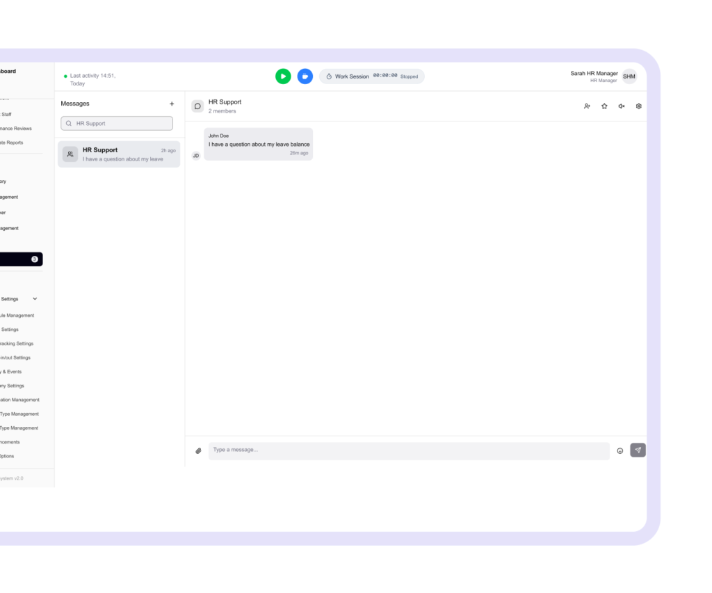 Yes. OXhrm’s built-in chat system is designed as a secure internal communication tool for your organization. All conversations are encrypted, and only authorized users within your company can access chats. You can create 1-on-1 conversations or team groups, and there’s no risk of data leaks since everything stays within your company’s OXhrm environment. This reduces reliance on third-party apps like Skype or Slack and ensures better control over communication.