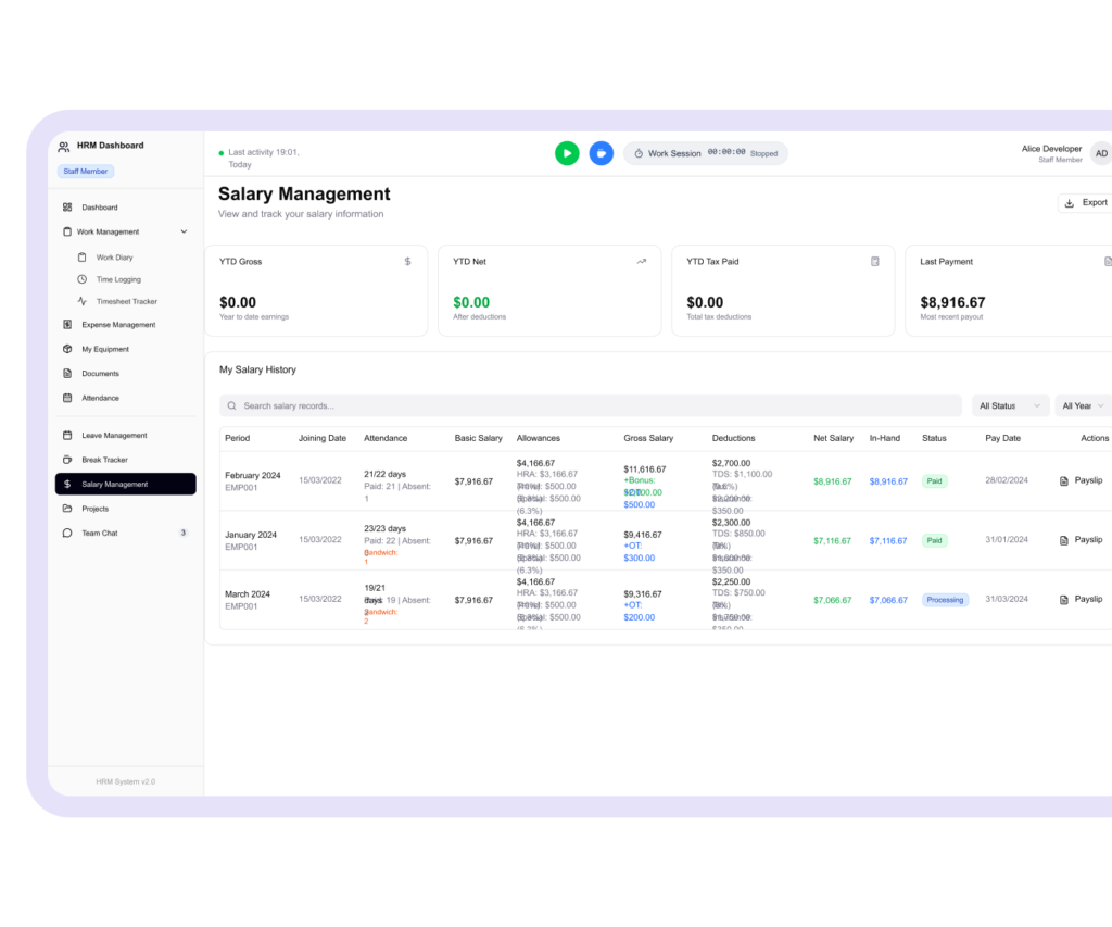 Submit expenses, view payslips, and request advance payouts instantly. Financial clarity and control — made effortless.
