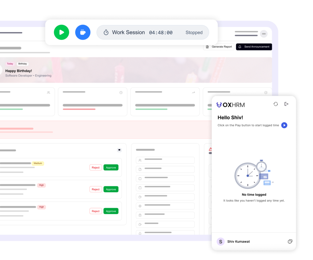Absolutely. OXhrm is optimized for remote and hybrid workforces. Employees can clock in from approved IPs or geo-locations, and you can track their activity levels, app usage, and idle time — all while respecting privacy and compliance. The dashboard offers real-time visibility into who’s working, when, and how productively, no matter where your team is located.
